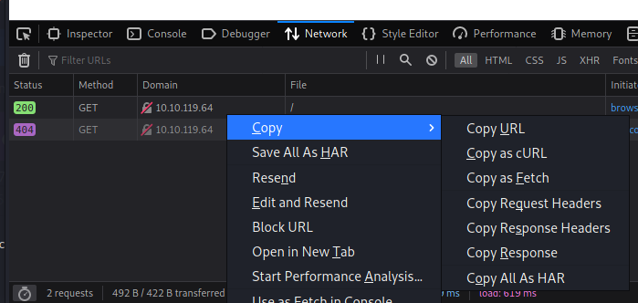 Copy as cURL curl 'http://10.10.119.64/' -H 'User-Agent: meow' -H 'Accept: text/html,application/xhtml+xml,application/xml;q=0.9,image/webp,*/*;q=0.8' -H 'Accept-Language: en-US,en;q=0.5' --compressed -H 'Connection: keep-alive' -H 'Upgrade-Insecure-Requests: 1' -H 'Cache-Control: max-age=0, no-cache' -H 'Pragma: no-cache'curl 轉 Python request- 我使用這個網站 https://curl.trillworks.com/把 curl 貼上就可以自動轉 python 的 request 了接下來寫一段扣爆破因為如果猜錯他會回傳的字都是一樣的,那就猜測輸入正確時,他回傳的東西會不一樣,所以最簡單的方法可以用字串長度來比對,輸入錯誤時長度是 218 運氣很好,C 就猜到ㄌ