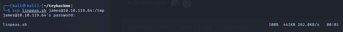 Roswell alien autopsy繼續提權- 透過 scp 上傳 Linpeas本機scp linpeas.sh james@10.10.119.64:/tmp