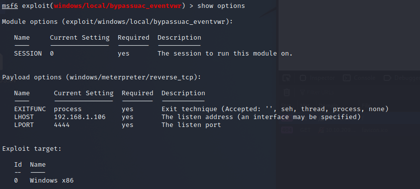 Running the local exploit suggester will return quite a few results for potential escalation exploits. What is the full path (starting with exploit/) for the first returned exploit?- 第一個回傳的是 exploit/windows/local/bypassuac_eventvwr按下鍵盤ctrl + z先把 meterpreter session 丟去背景- 準備來下 explit 指令- 輸入