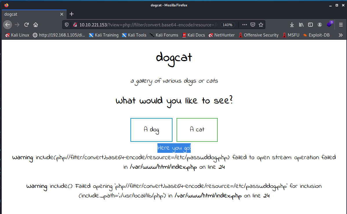 http://10.10.221.153/?view=php://filter/convert.base64-encode/resource=./dog/../dog - 會發現可以成功開啟狗勾嘗試觀察