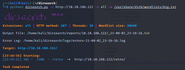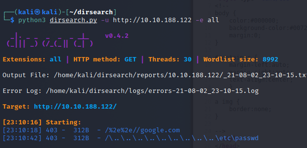 這邊我用了 dirb的bigWordlist-python3 dirsearch.py -u http://10.10.188.122 -e all -w /usr/share/dirb/wordlists/big.txt