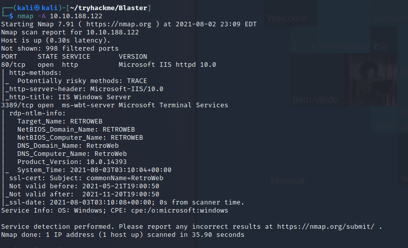 - 3389How many ports are open on our target system?- 2Looks like there’s a web server running, what is the title of the page we discover when browsing to it?- nmap 就告訴我們ㄌ