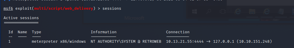 sessions- 可以觀察到目前有一個 meterpreter 的 sessions