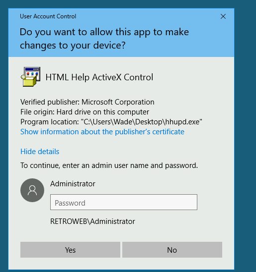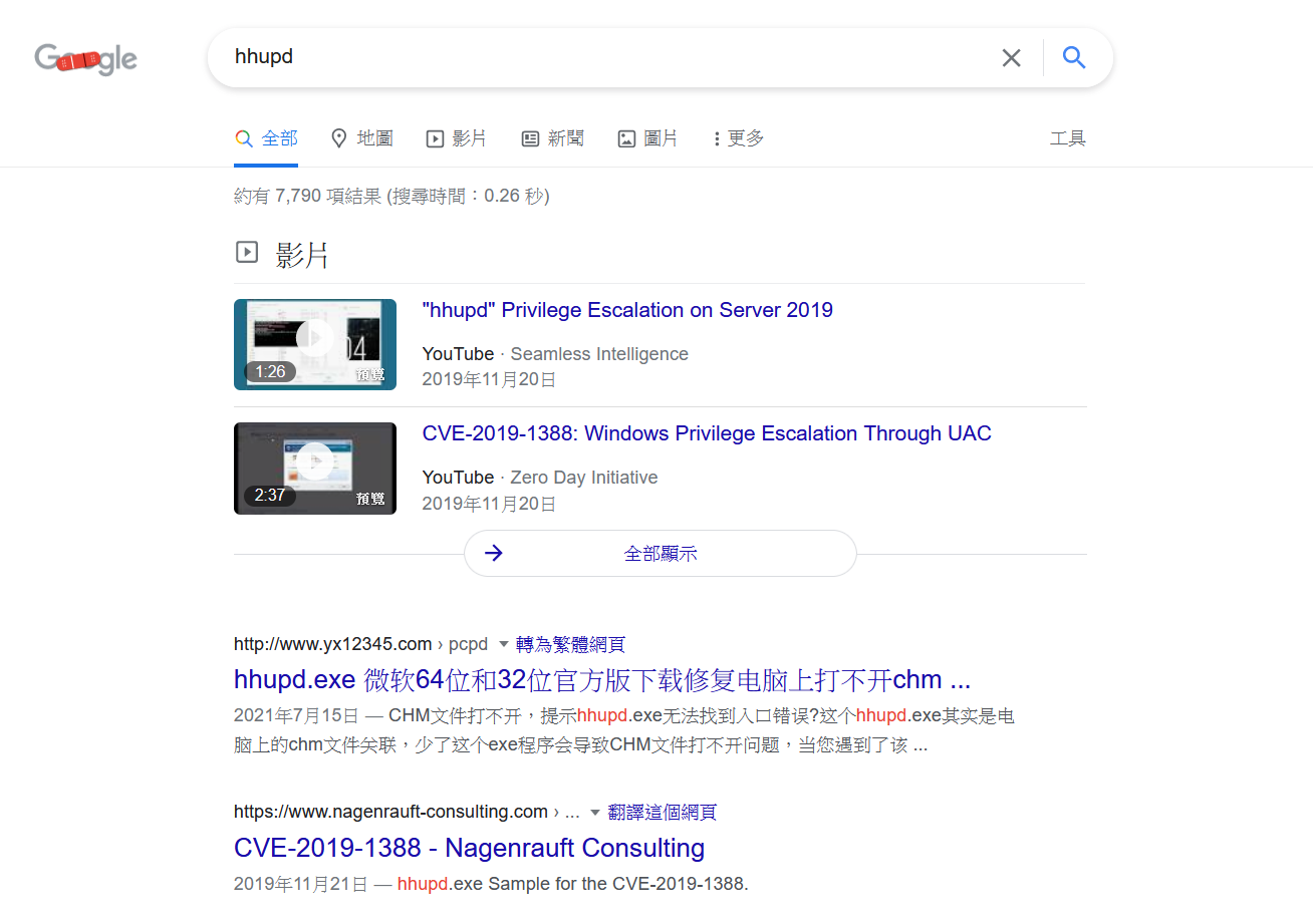 CVE-2019-1388 提權When enumerating a machine, it’s often useful to look at what the user was last doing. Look around the machine and see if you can find the CVE which was researched on this server. What CVE was it?- 完成正規解可以在瀏覽器蛛絲馬跡上找到的答案QQ CVE-2019-1388Looks like an executable file is necessary for exploitation of this vulnerability and the user didn’t really clean up very well after testing it. What is the name of this executable?- 桌面上的檔案hhupd透過觀察網路上的資源- https://github.com/jas502n/CVE-2019-1388- 可以發現 CVE-2019-1388 是一個很酷ㄉ洞,基本實作細節如下1. 對著
