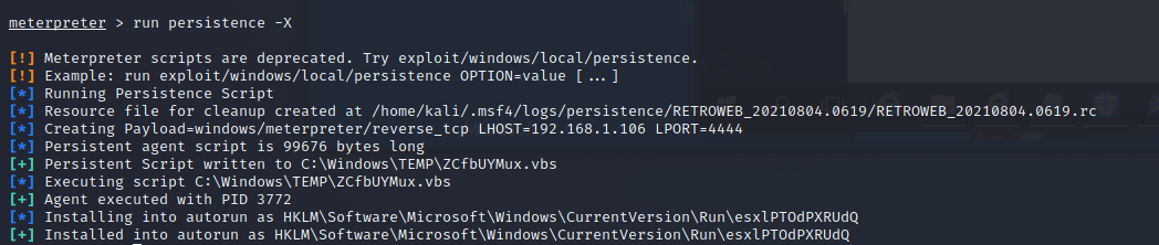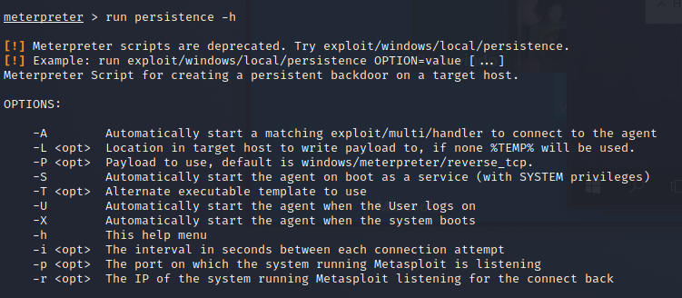 Last but certainly not least, let’s look at persistence mechanisms via Metasploit. What command can we run in our meterpreter console to setup persistence which automatically starts when the system boots? Don’t include anything beyond the base command and the option for boot startup.- 先執行 run persistence -h