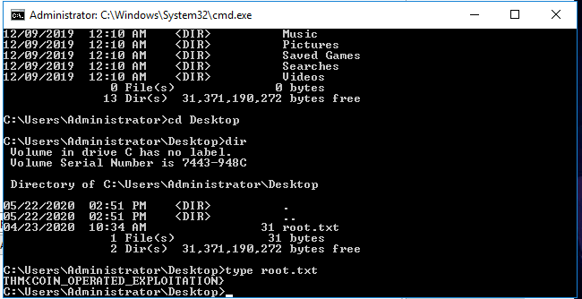 Now that we’ve confirmed that we have an elevated prompt, read the contents of root.txt on the Administrator’s desktop. What are the contents? Keep your terminal up after exploitation so we can use it in task four!- THM{COIN_OPERATED_EXPLOITATION}以下接段踩了非常多雷 QQQ先回到 cmd,我們把所有 Windows 的防火牆、Defender 全部都殺掉輸入