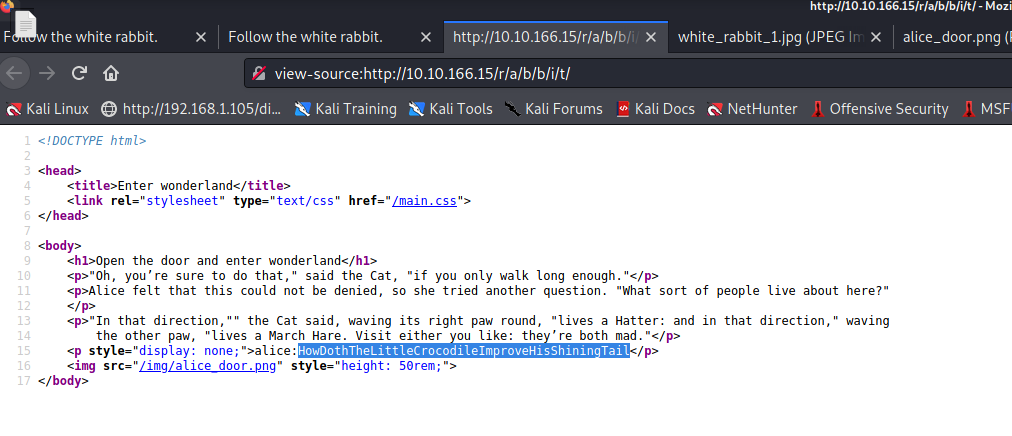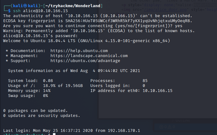 :隔開說不定,上面那串就是 alice 的密碼!嘗試ssh登入看看ssh alice@10.10.166.15密碼HowDothTheLittleCrocodileImproveHisShiningTail