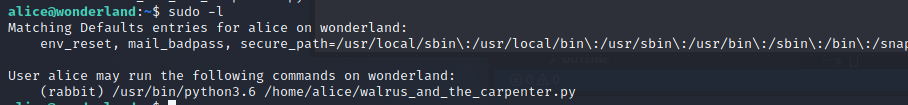 rabbit使用者身分執行/usr/bin/python3.6 /home/alice/walrus_and_the_carpenter.py - 所以執行方法應該如下