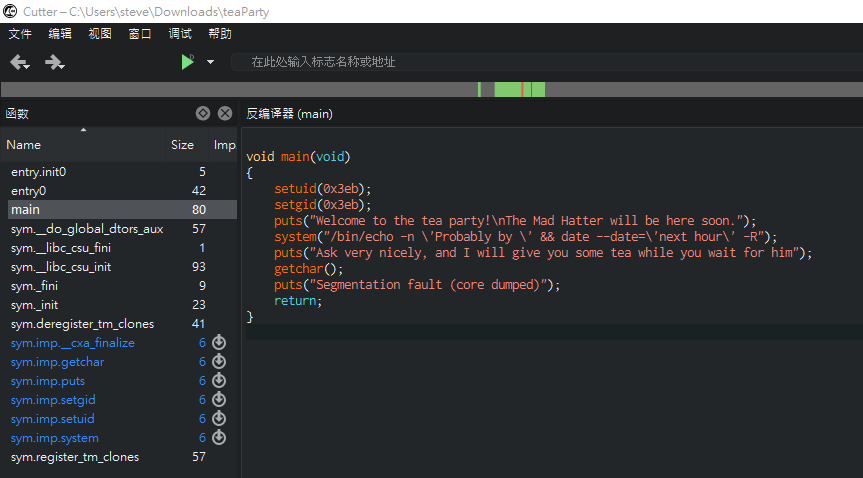 pwn了吧 QWQ好吧,那我們先把檔案抓出來分析看看-cp teaParty /tmp chmod 777 /tmp/teaParty- 本機