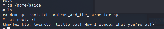 rabbit使用者執行看看sudo -u rabbit /usr/bin/python3.6 /home/alice/walrus_and_the_carpenter.py - 就會發現我們噴成 rabbit 的 shell 了!