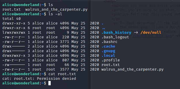alice的家目錄有一個沒有權限讀的root.txt