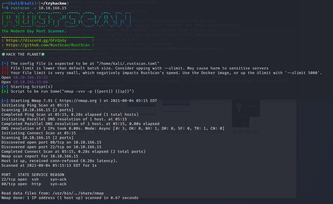 RustScan wget https://github.com/RustScan/RustScan/releases/download/2.0.1/rustscan_2.0.1_amd64.debsudo dpkg -i rustscan_2.0.1_amd64.deb``rustscan -a 10.10.166.15-