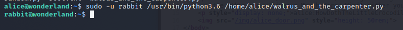 sudo -u rabbit /usr/bin/python3.6 /home/alice/walrus_and_the_carpenter.py
