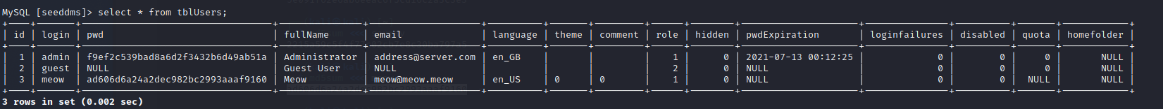 mysql INSERT INTO tblUsers (id,login,pwd,fullName,email,role,language,theme,comment) VALUES (3,"meow","4a4be40c96ac6314e91d93f38043a634","Meow","meow@meow.meow",1,"en_US",0,0);-