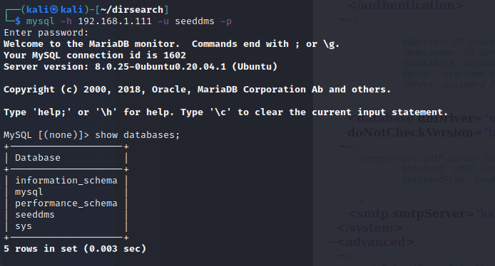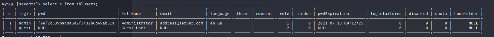 /conf/可能有重要的資訊/conf/settings.xml可以存取- 裡面找到 mysql 的帳密seeddms