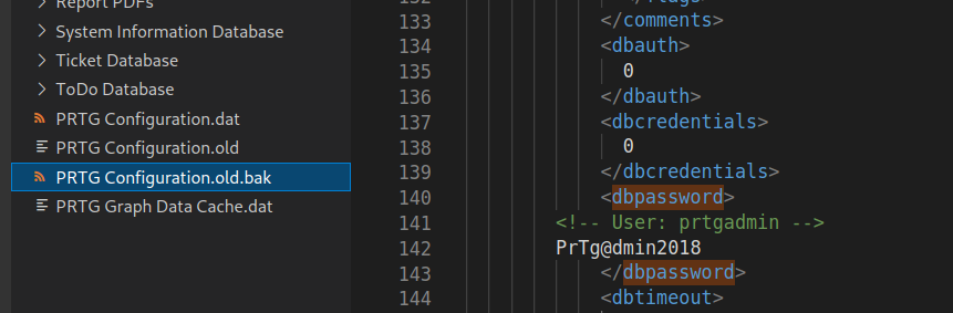 看到相關的檔案有以下幾個- PRTG Configuration.old.bakPRTG Configuration.datPRTG Configuration.oldConfiguration Auto-Backups/*``PRTG Configuration.old.bak 應該最可疑-