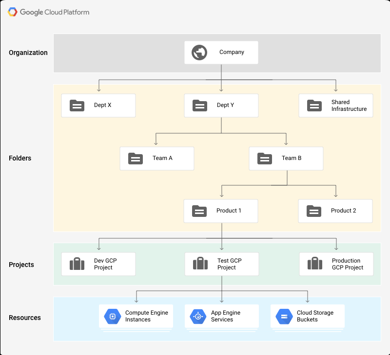 GCP 也可以透過階層式的進行管理,以一個公司為例,通常會使用組織節點 (Organization Node),而一個公司底下可能會有不同的部門,這個時候就可以透過資料夾 (Folders) 進行管理,而每一個部門底下也可能會有多個 Project;每個 Project 底下則又可以有多個 Resources,範例如下圖所示。