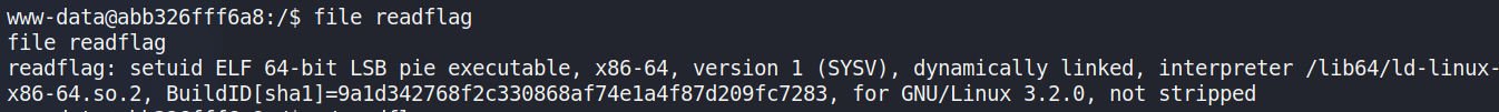 readflag,它有 SUID 且 Owner 是 Root - 透過 file 觀察可以確定它是一個執行檔