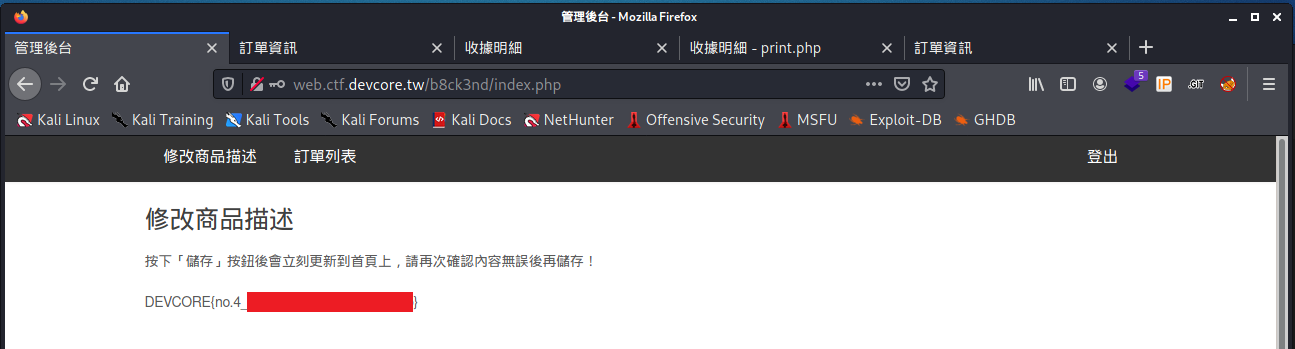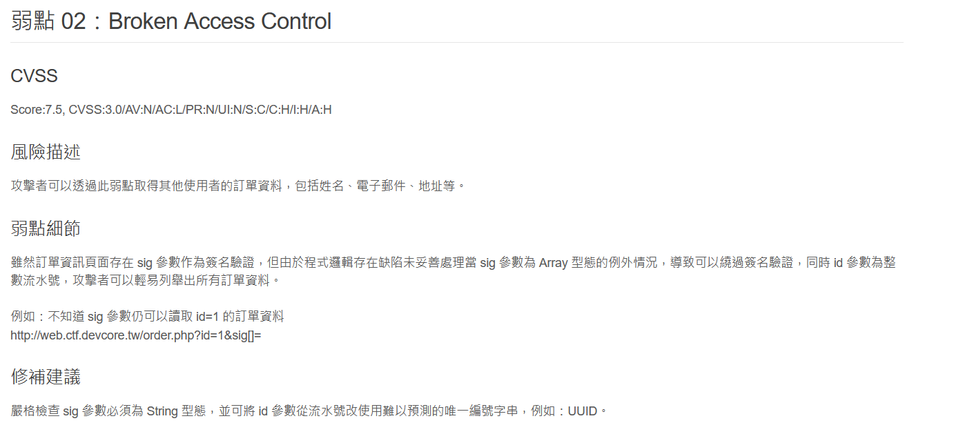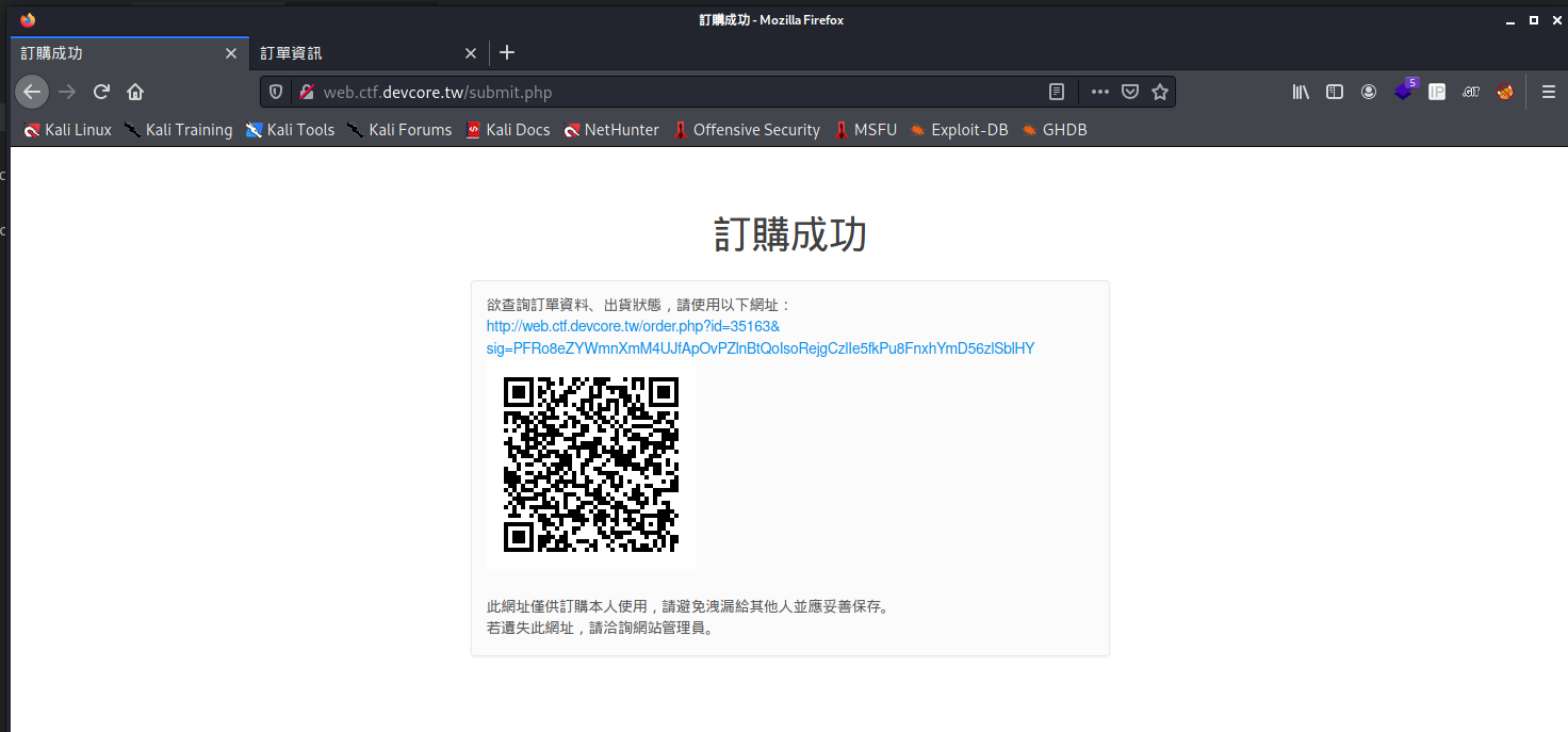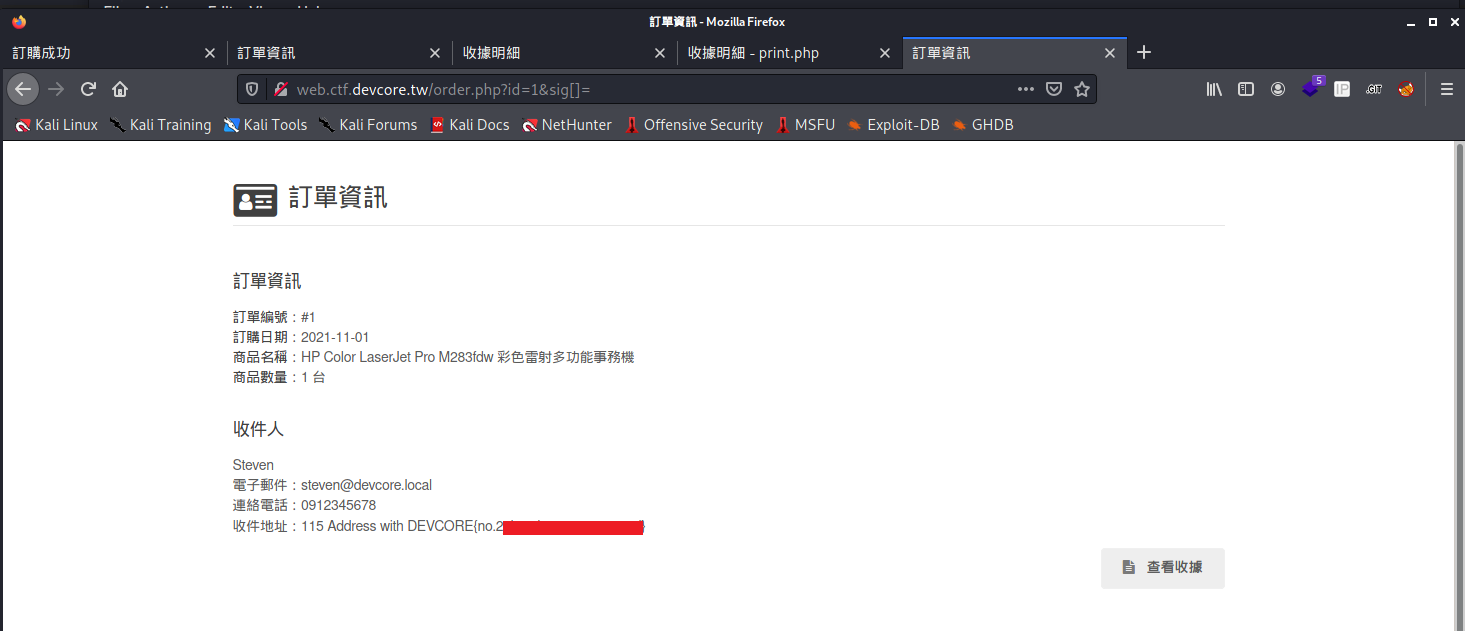 欸好ㄛ,我的方法是一個非預期解的意思,那我們來看一下正規解- http://web.ctf.devcore.tw/order.php?id=1&sig[]=- 就拿到 Flag 了