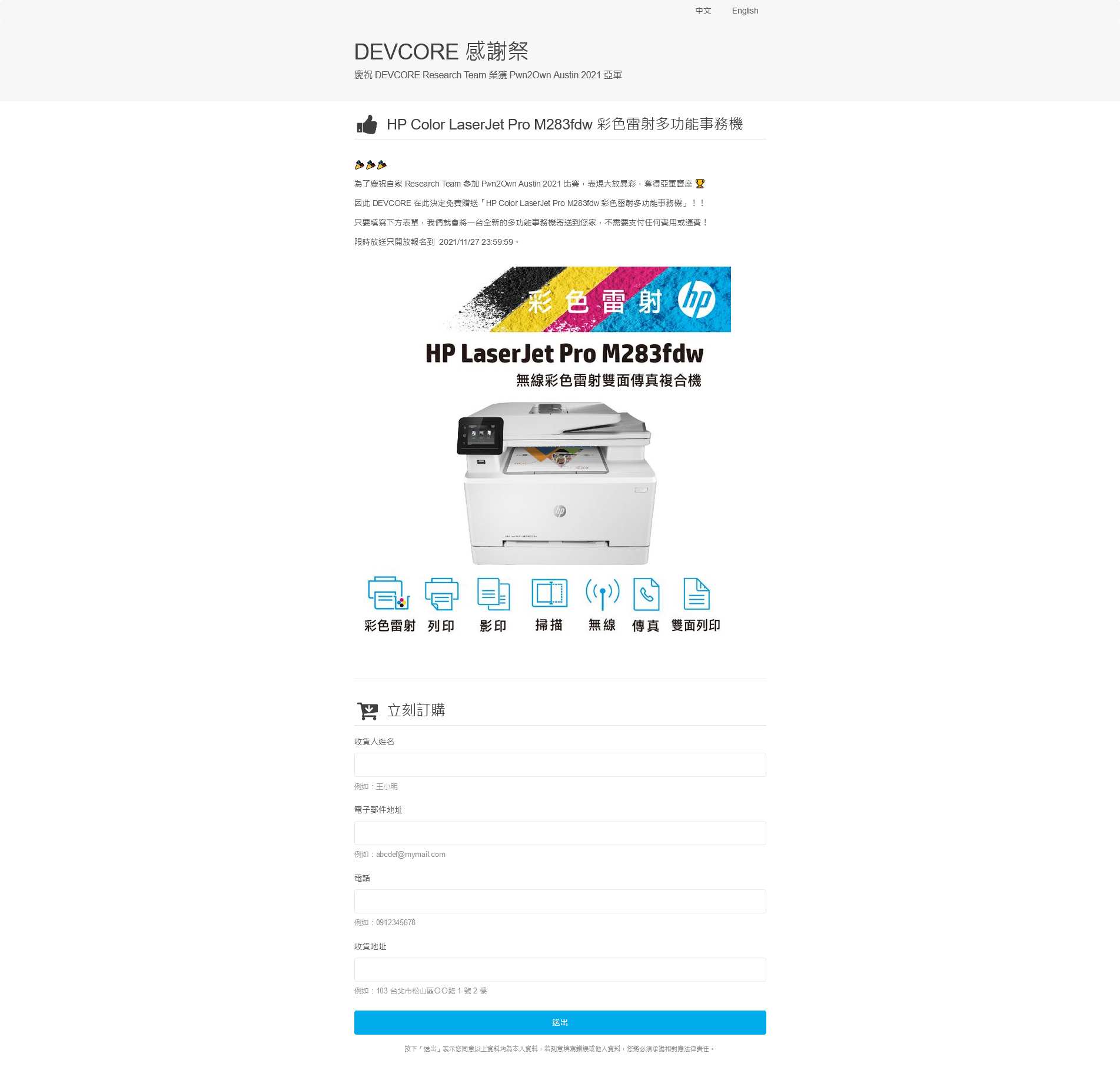 - URL : https://wargame.devcore.tw/Web : http://web.ctf.devcore.tw/今年與去年一樣,在 HITCON 會場上有 DEVCORE 的擺攤,解 Wargame 就可以換小獎品與 NFT,而且據說今年的題目都是來自現實生活中的真實案例改編,我覺得題目比起去年明顯的簡單了不少。但我還是覺得在 HITCON 辦這種活動不太優 QQ 會害人無法專心聽議程,都在解題。畢竟這種 Conf,我覺得聽議程還是比較重要 Q__Q。