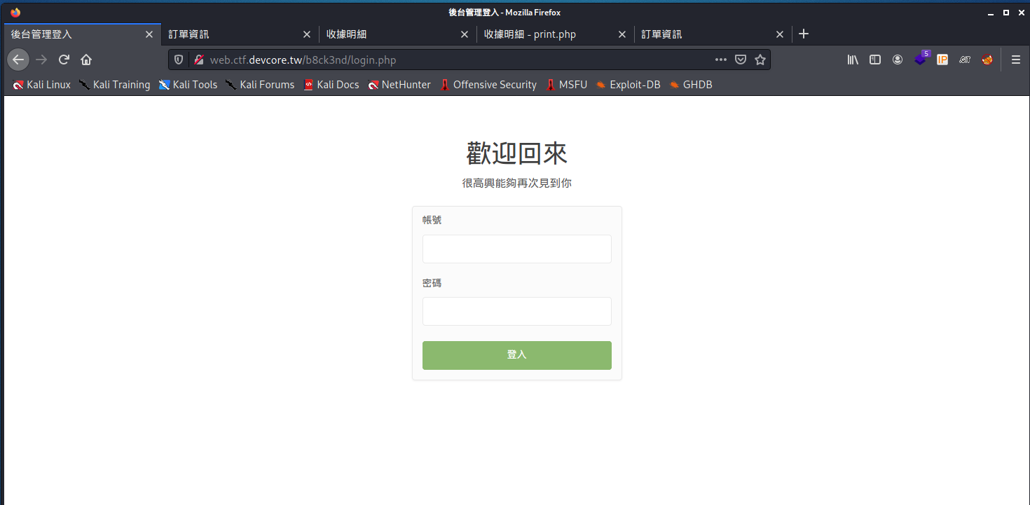 順利訪問後台 http://web.ctf.devcore.tw/b8ck3nd/login.php-
