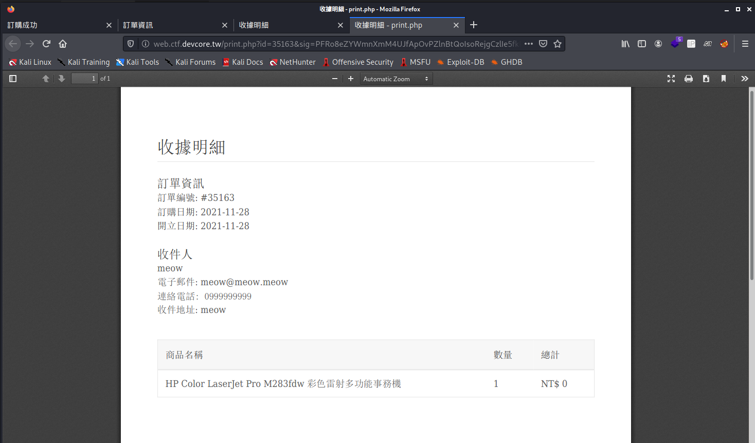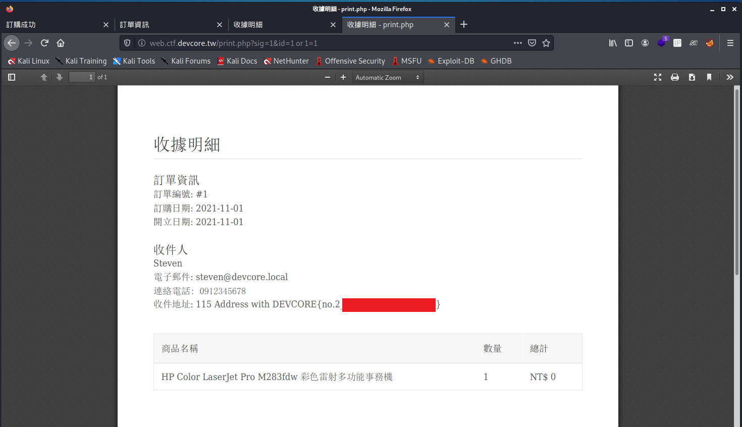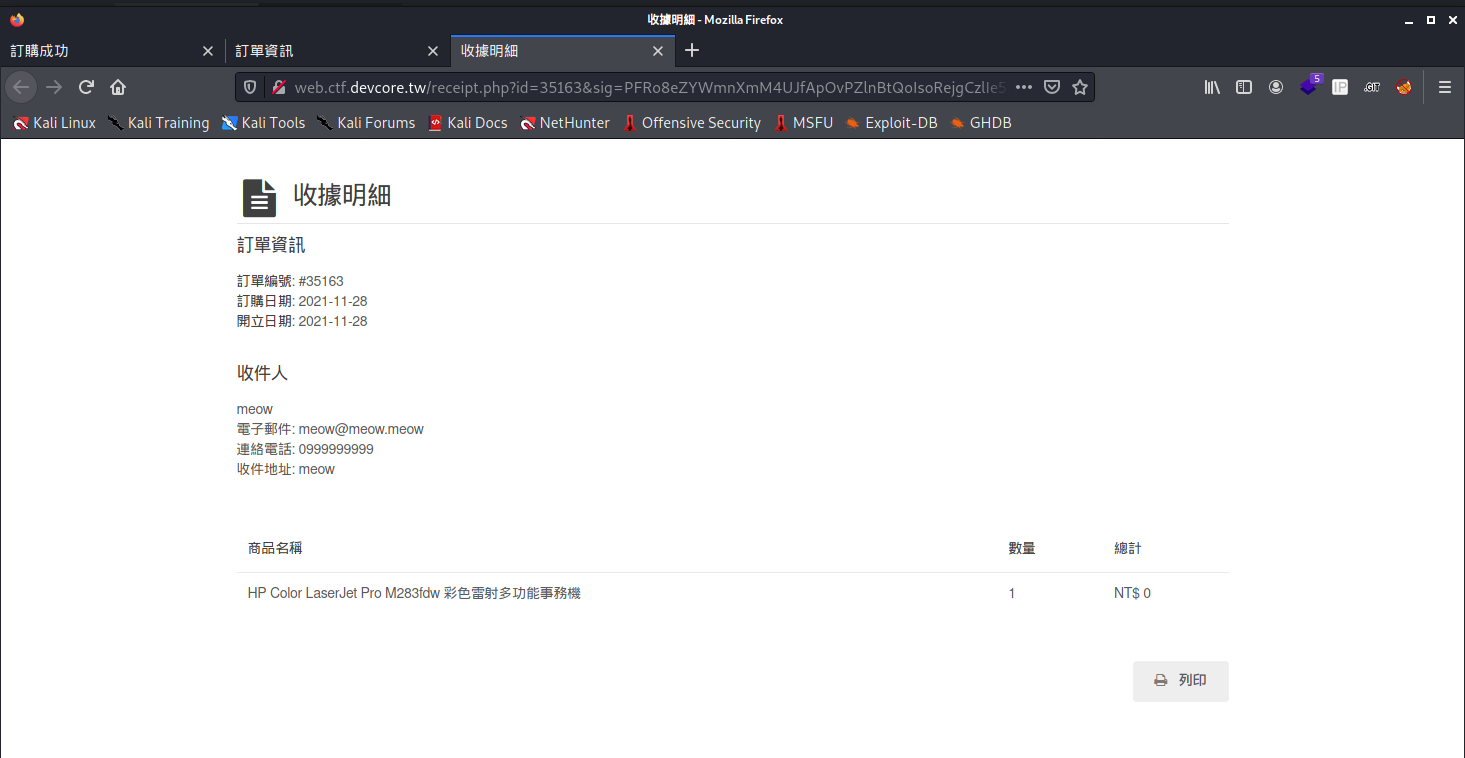 觀察以上幾個頁面的原始碼,我們可以快速的發現 print.php上面有一個 SQL injection 的弱點php $res = $pdo->query(" SELECT * FROM orders WHERE sig_hash = '$sig_hash' AND id = $id LIMIT 1 ", PDO::FETCH_ASSOC);- 使用者可控id的部分我們可以隨意來寫個http://web.ctf.devcore.tw/print.php?sig=1&id=1 or 1=1然後就拿到 Flag 了 ?__?