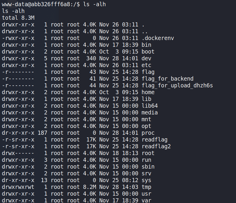 - 從上面的一堆垃圾可以確認我們真的在 docker 裡面